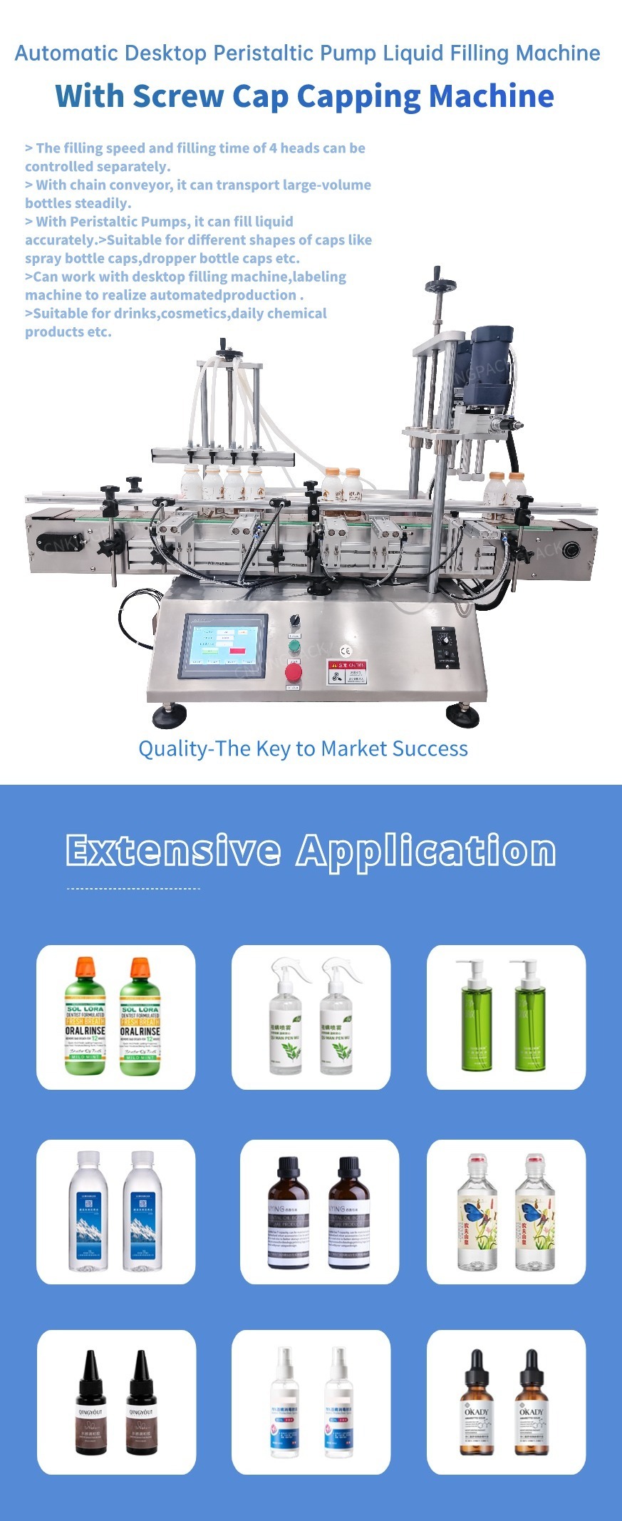 Automatic desktop peristaltic pump liquid filling machine with screw cap capping machine With peristaltic pump, it has the advantage of high temperature resistance and corrosion resistance. Durable and reliable.this machine with high-quality chain conveyor belt, it can transport large-volume containers smoothly and steadily.The filling speed of four nozzles can be controlled separately.With PLC control panel, it is easy to set the working parameters.