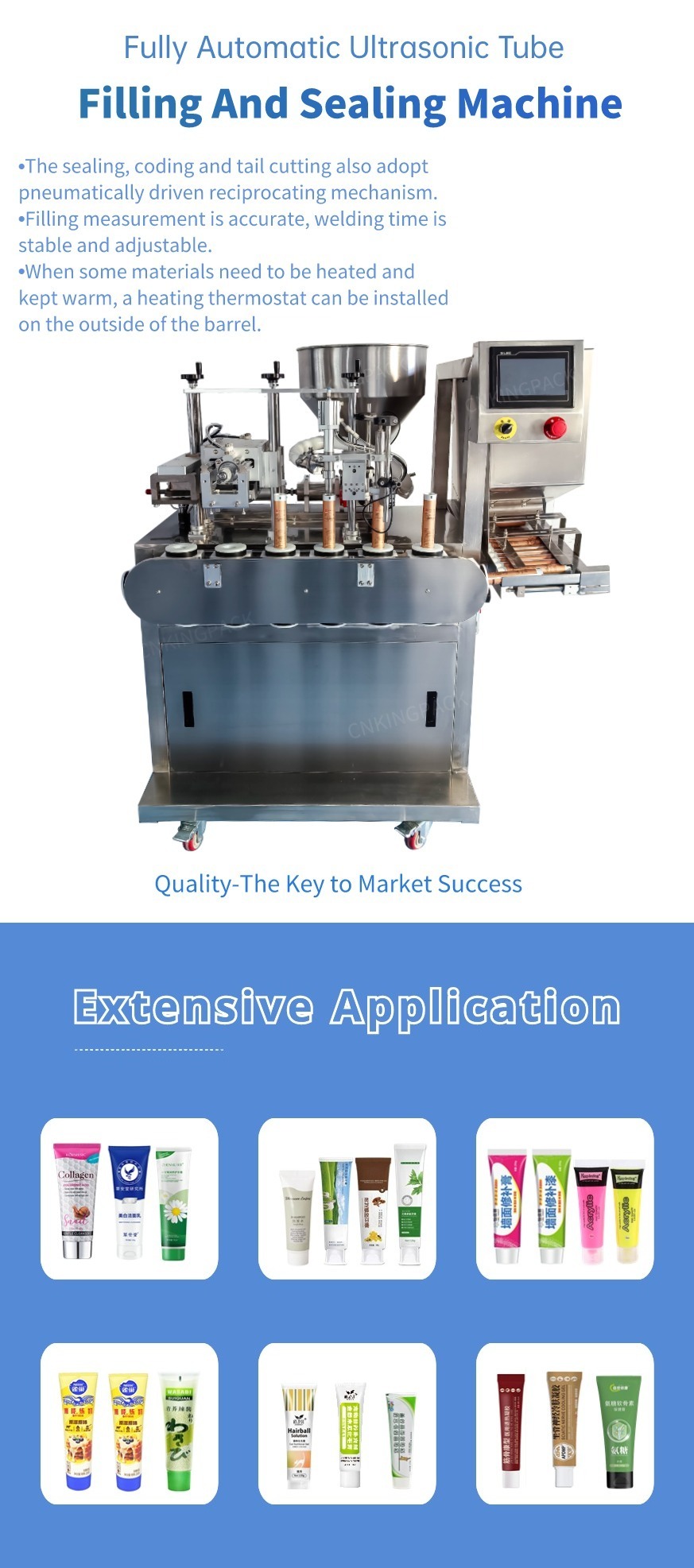 The ultrasonic tube filling and sealing machineis designed with 6 stations, utilizing a servo motor to drive the circular chain for intermittent movement, ensuring that the14 clamps installed on the circular chain move at equal distances. It is the sealing machine selected by industries such as cosmetics, pharmaceuticals, adhesive shoe polish, food, etc., as well as other industries.