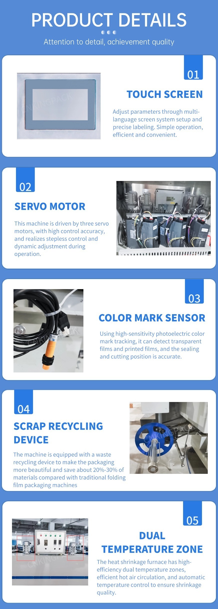 This machine is simple in operation,reliable in quality and stable in performance.With variable frequency modulation number and stepless variable speeds.The control set of complete machine is completed by PLC,reducing the fault point.High efficient double temperature zone in heat shrink furnace,non-polar speed regulation and automatic tempersture control.Efficient hot air circulation for the quality of contraction.