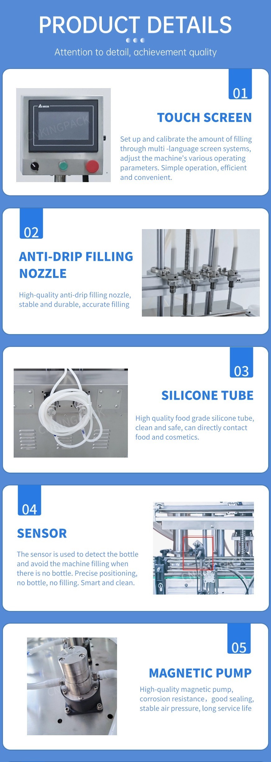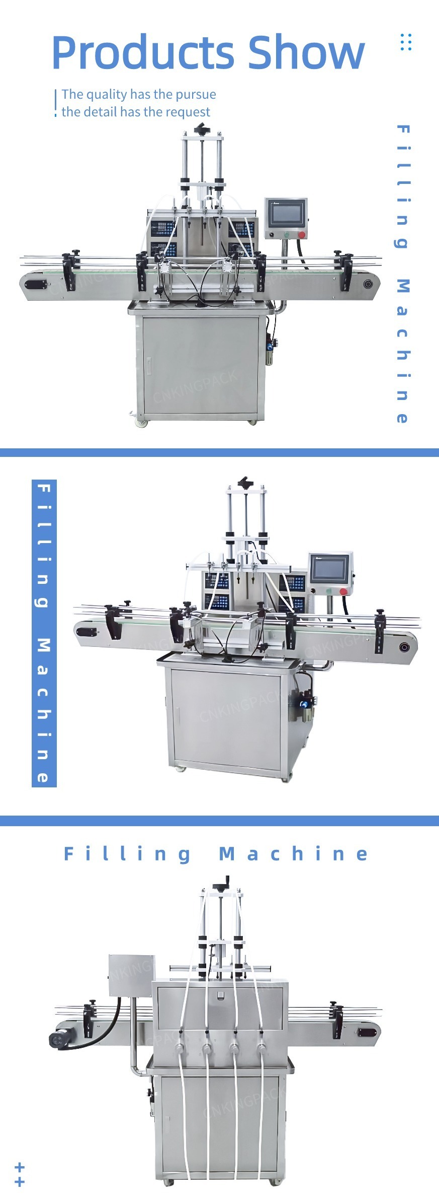 - Four head magnetic pump filling machine rely on magnetic drive pump head, pump wheel and motor shaft connection, don't worry about damage of the shaft sealing drip or pump under the high load and burn out.