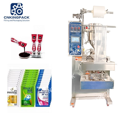 This machine is suitable for packing sauce,like ketcup,shampoo,chili sauce,and so on. The hopper can mix the product evenly.PLC touch screen control the machine. The bag style can be 3 sides sealing,back sealing and four sides sealing.