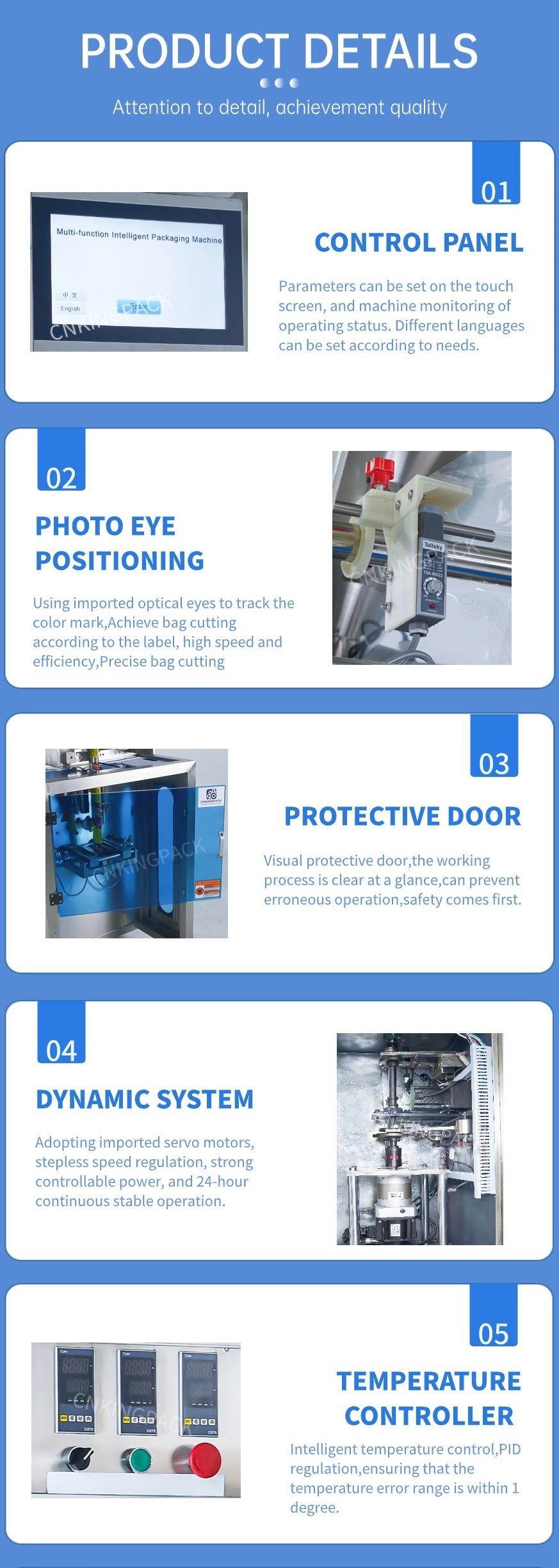 This machine adopts a well-known brand of touch screen PLC and servo motor, with stable operation and fast packaging speed. It automatically completes a series of actions such as bag making, measuring, filling, counting, sealing, feeding, and package cutting.