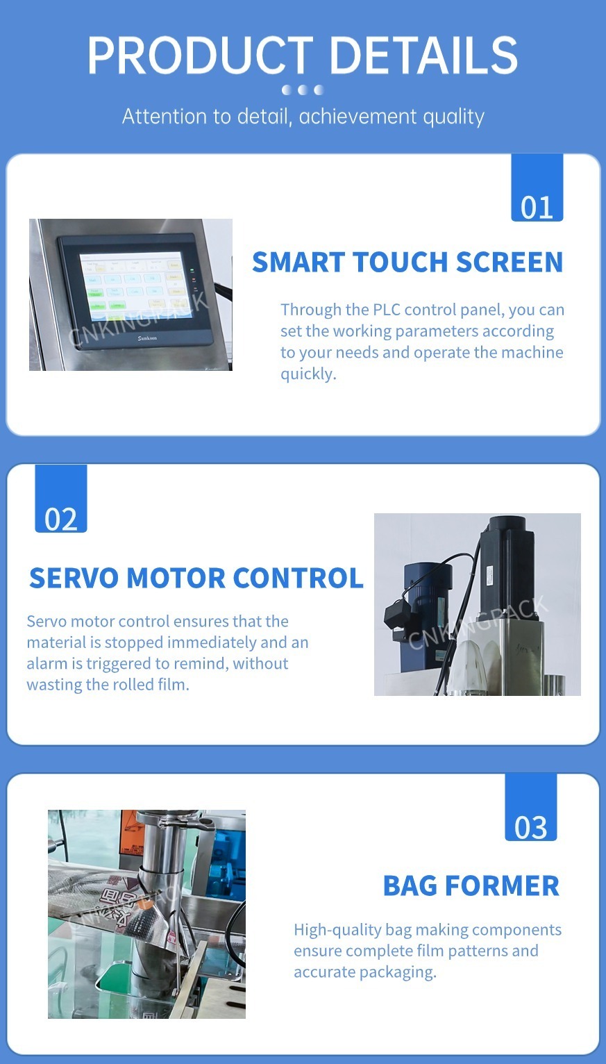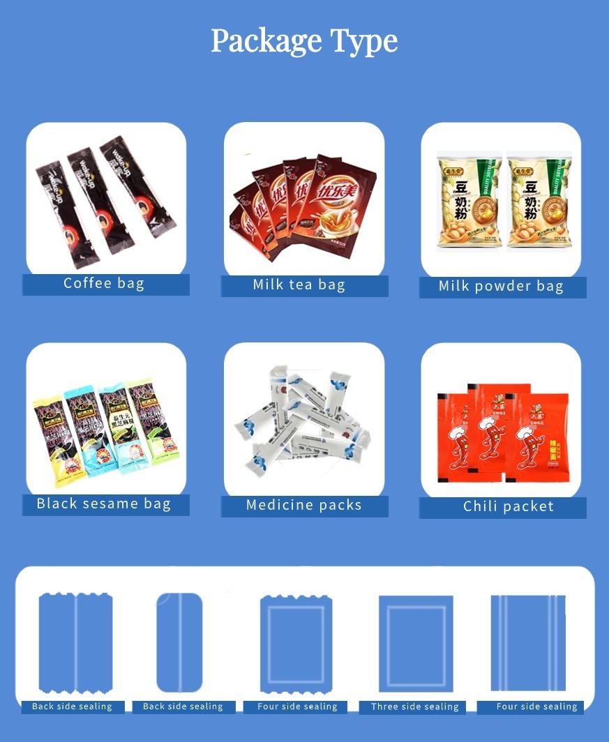 This is powder packing machine,it can pack milk powder, milk tea powder, protein powder, grain powder, and so on. The bag style can be three sides sealing,back sealing and four side sealing. It can also be made into special-shaped bags such as easy-to-tear bags.