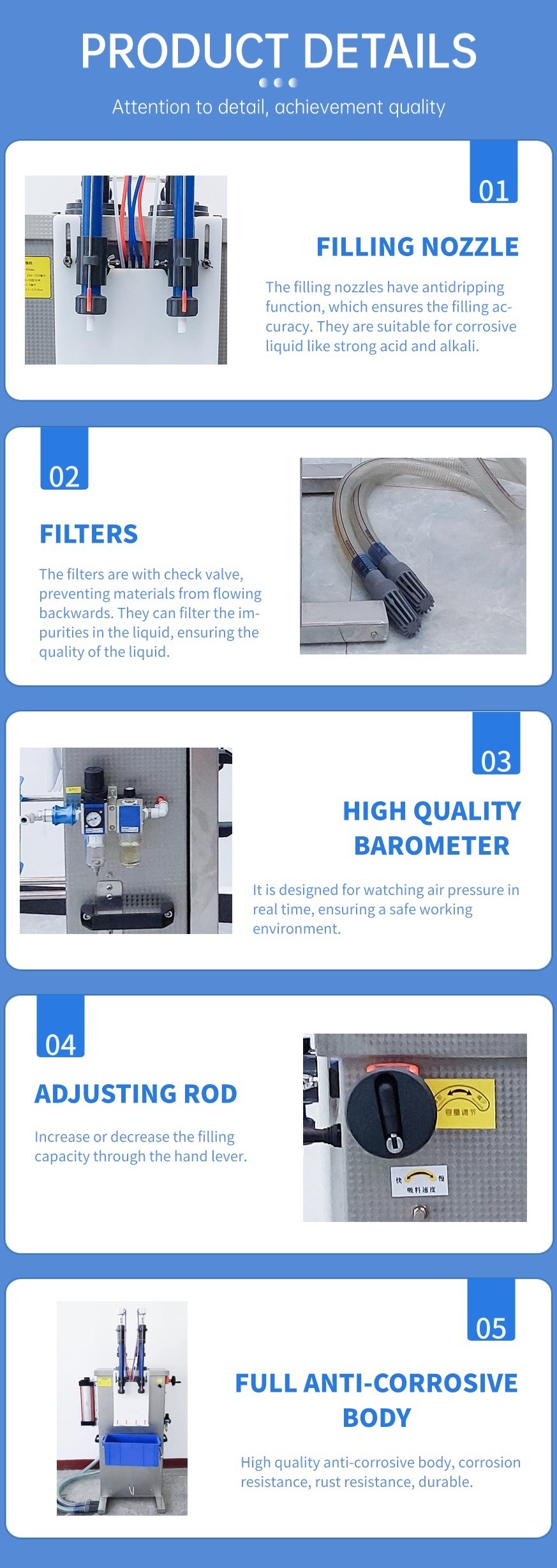 The semi-automatic anticorrosive liquid filling machine is suitable for filling corrosive materials of various special-shaped bottles. The filling operation is simple and convenient. It is suitable for corrosive materials such as toilet cleaner, pesticides, alcohol, 84 disinfectant, insecticide, descaling agent, etc.