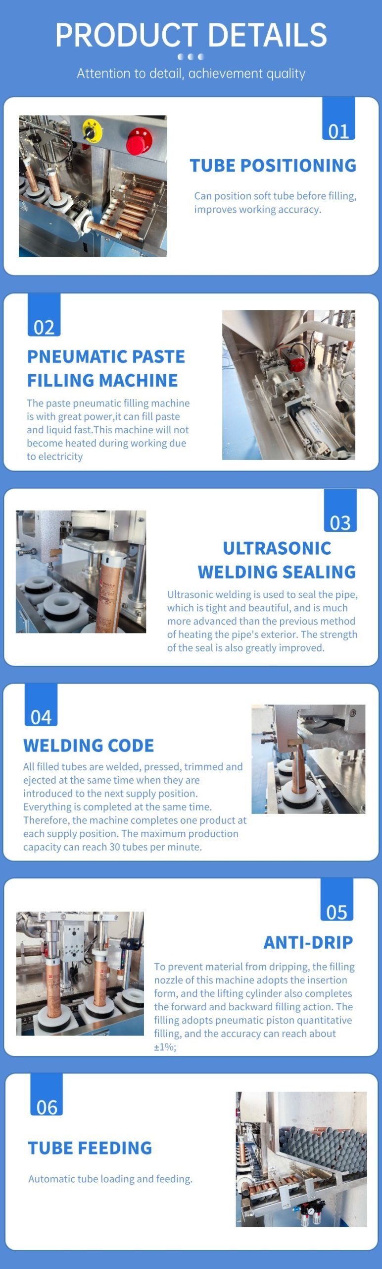 The ultrasonic tube filling and sealing machineis designed with 6 stations, utilizing a servo motor to drive the circular chain for intermittent movement, ensuring that the14 clamps installed on the circular chain move at equal distances. It is the sealing machine selected by industries such as cosmetics, pharmaceuticals, adhesive shoe polish, food, etc., as well as other industries.