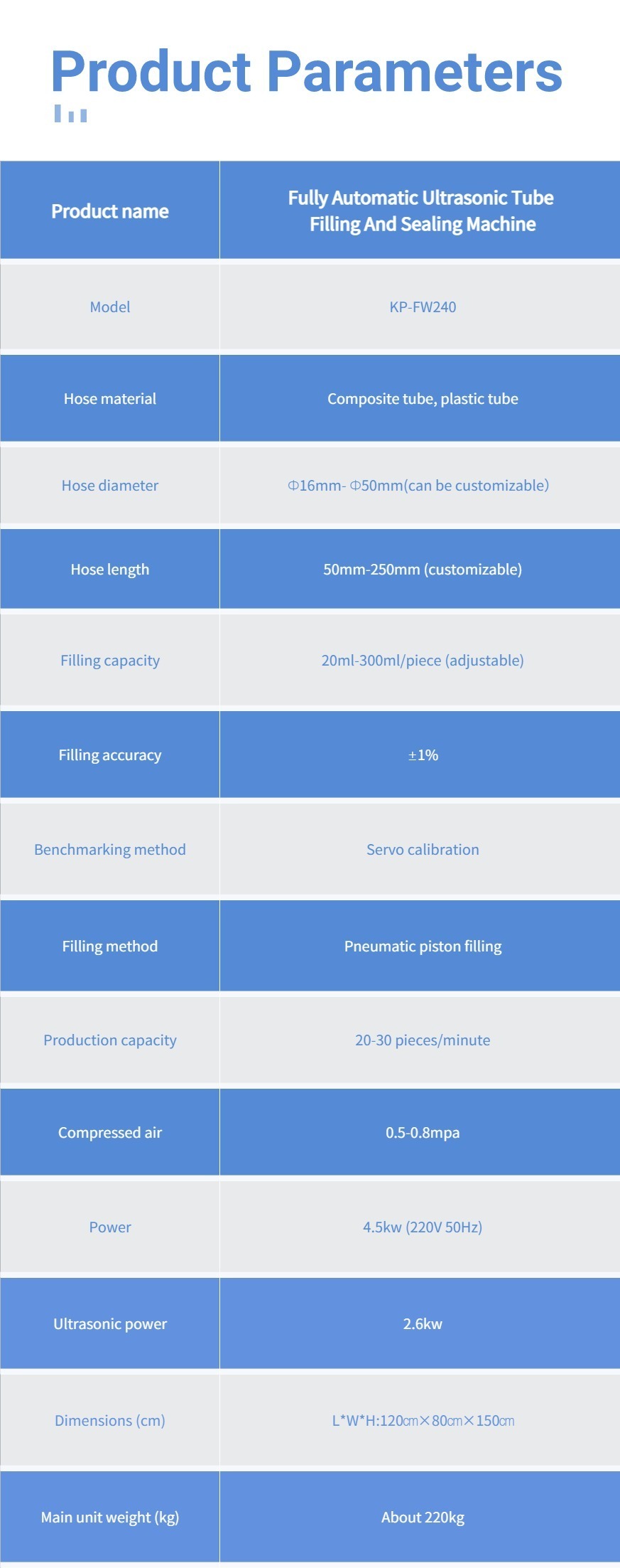 | Filling capacity | 20ml-300ml/piece (adjustable) |