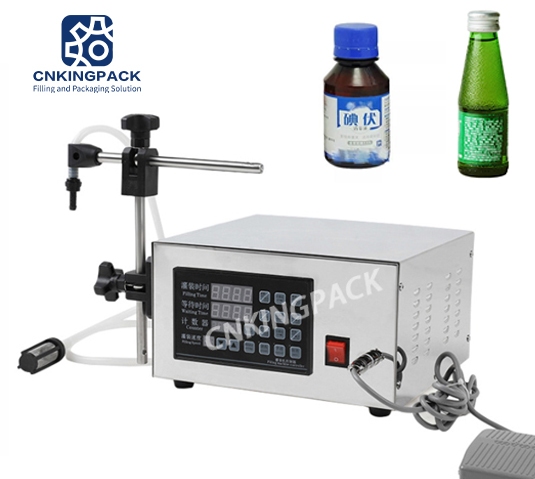 GFK-280 small digital control pump liquid filling machine use microcomputer control technology,high filling accuracy and reliable performance,it is suitable for filling low viscosity liquid products,such as water, oil, e-juice, e-cigarette, essential oil, coconut oil ,perfume etc,widely applied to food,commodity,cosmetic,medicine,chemical industries etc.