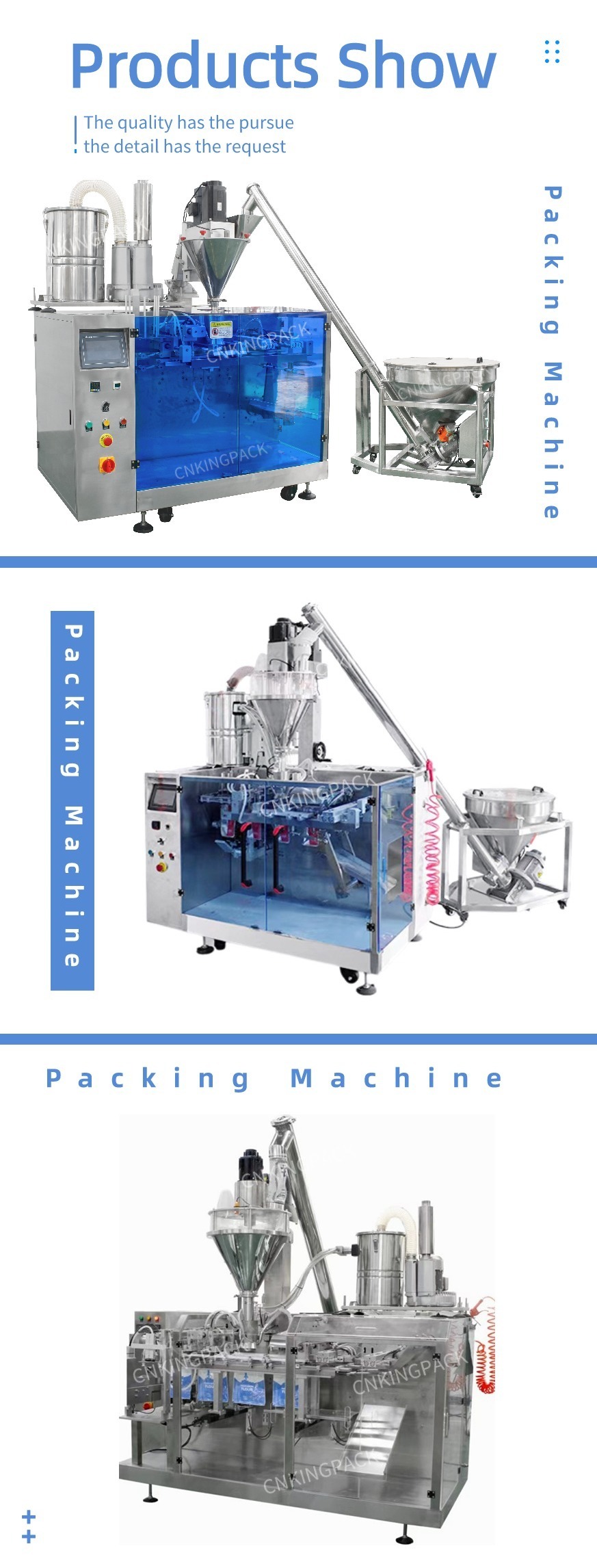 This is powder packing machine,it can pack milk powder, milk tea powder, protein powder, grain powder, and so on. The bag style can be three sides sealing,back sealing and four side sealing. It can also be made into special-shaped bags such as easy-to-tear bags.