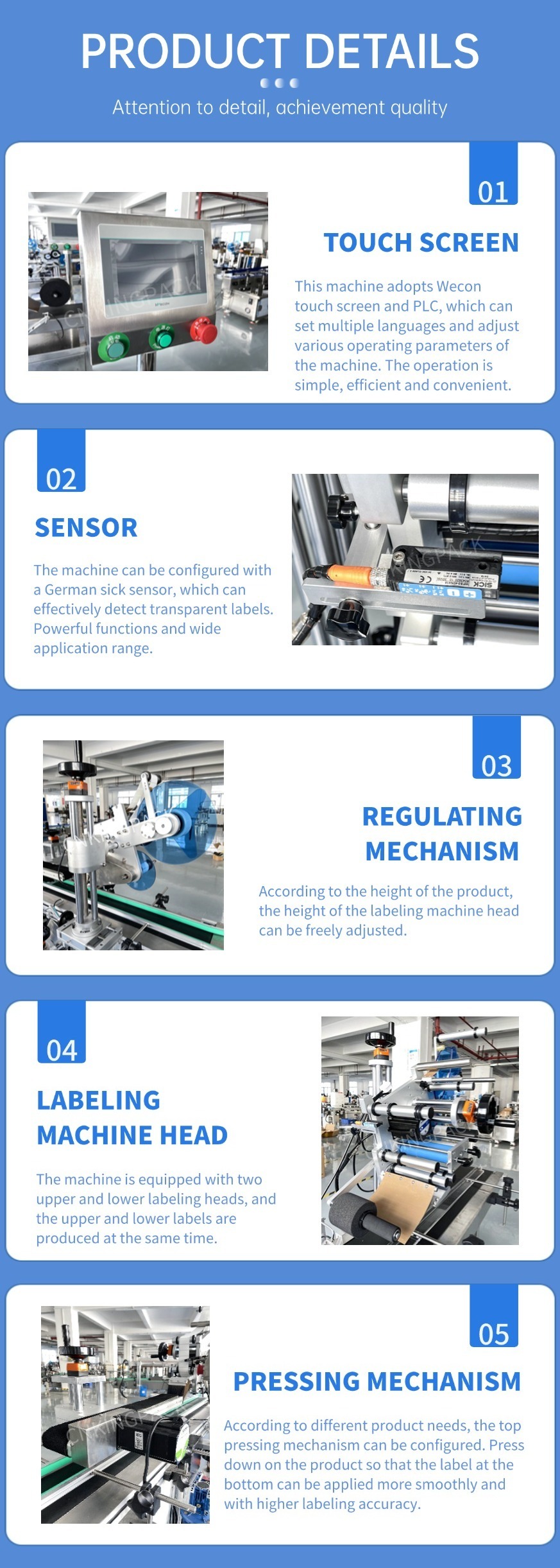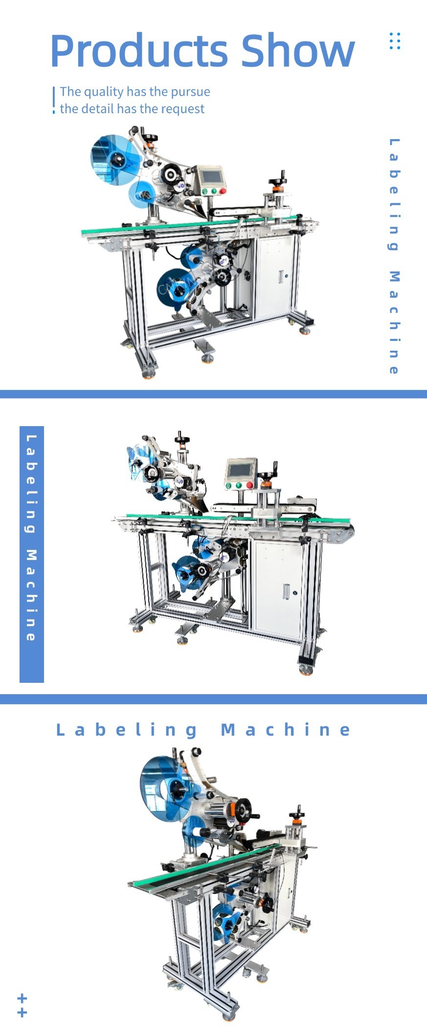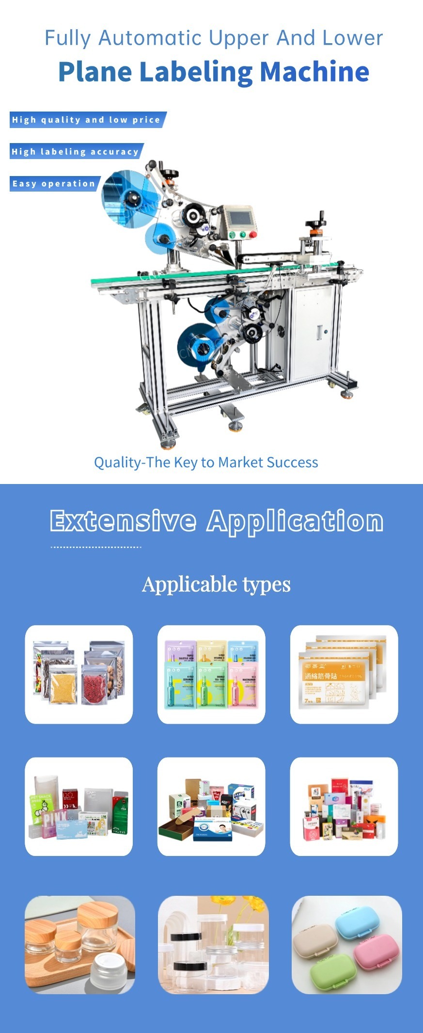 This machine has a wide range of applications, it supports labeling on all kinds of cards, paper, and unfoldedcartons. It indication of labeled bottles and protection of parameter setting (hierarchical authority to parameter setting) bring much convenience to production and management.