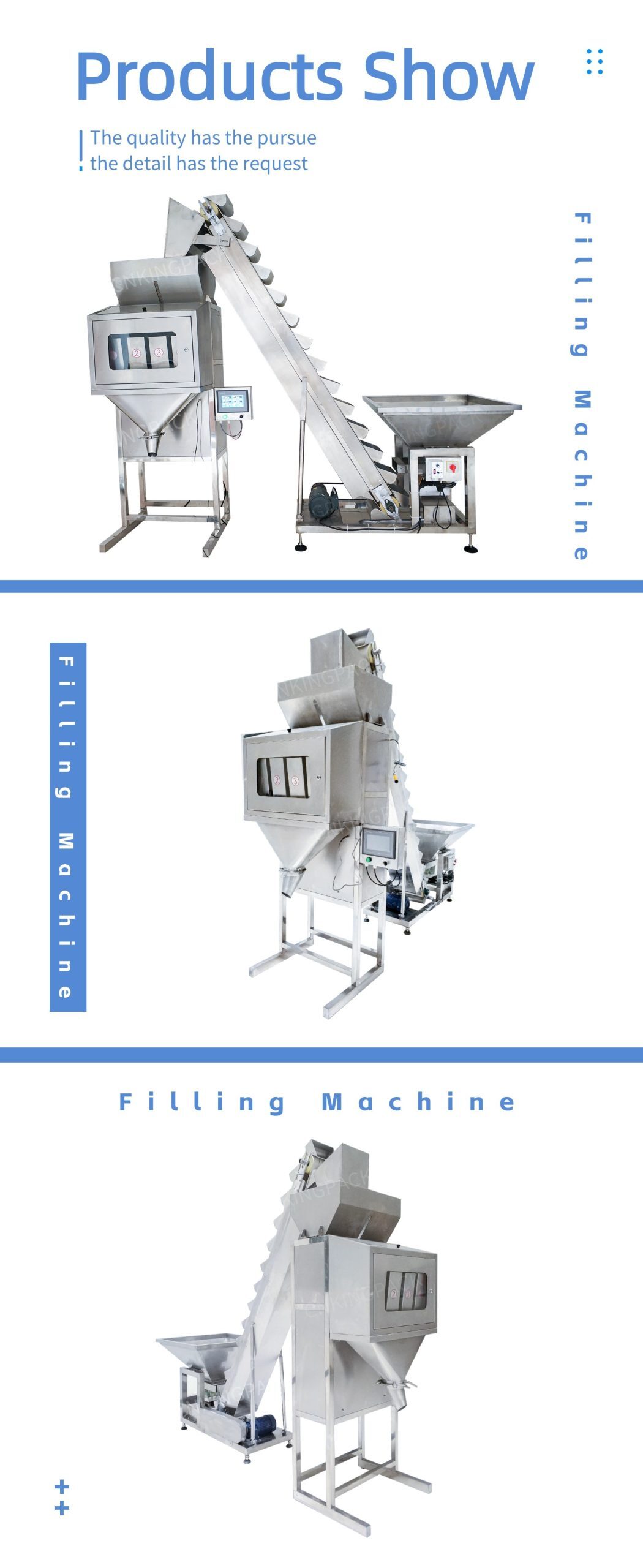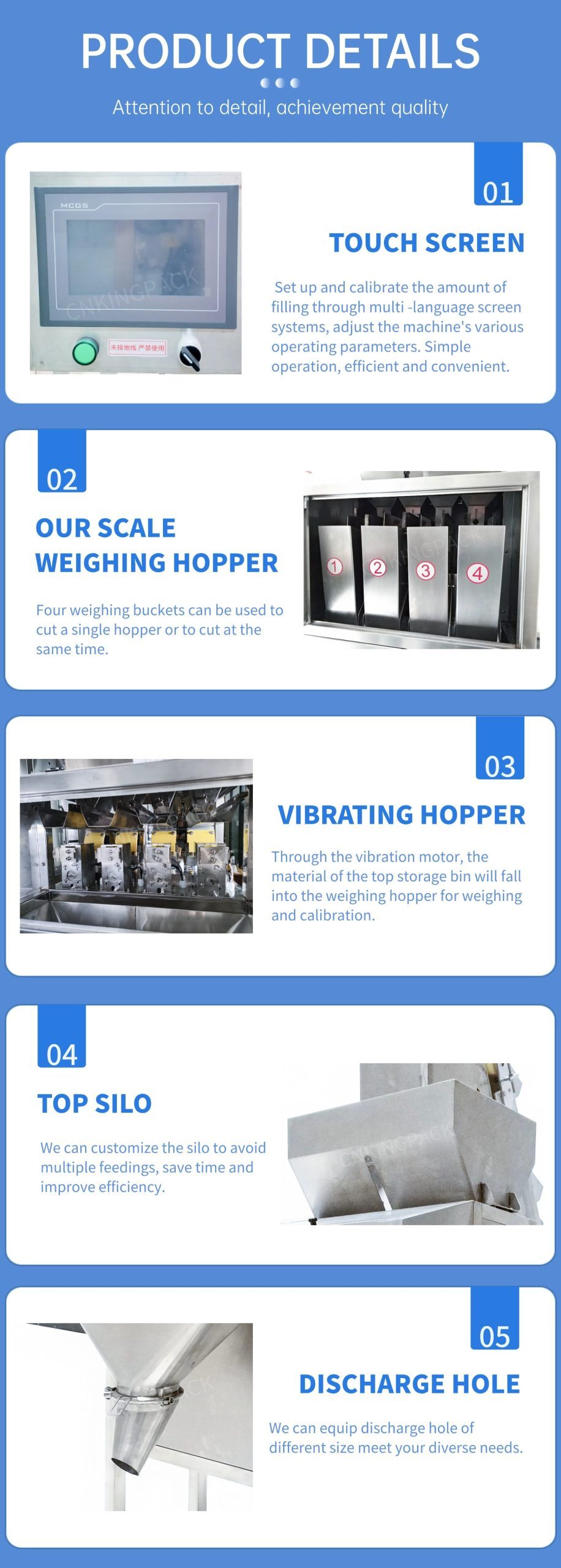 The machine is an intelligent weighing type automatic quantitative packaging machine, controlled by a microcomputer. Suitable for pesticides, chemical fertilizers, veterinary drugs, premixes, additives, washing powder, salt, monosodium glutamate, chicken essence, sugar, seeds, rice, leisure food, hardware and other granular, material quantitative packaging.