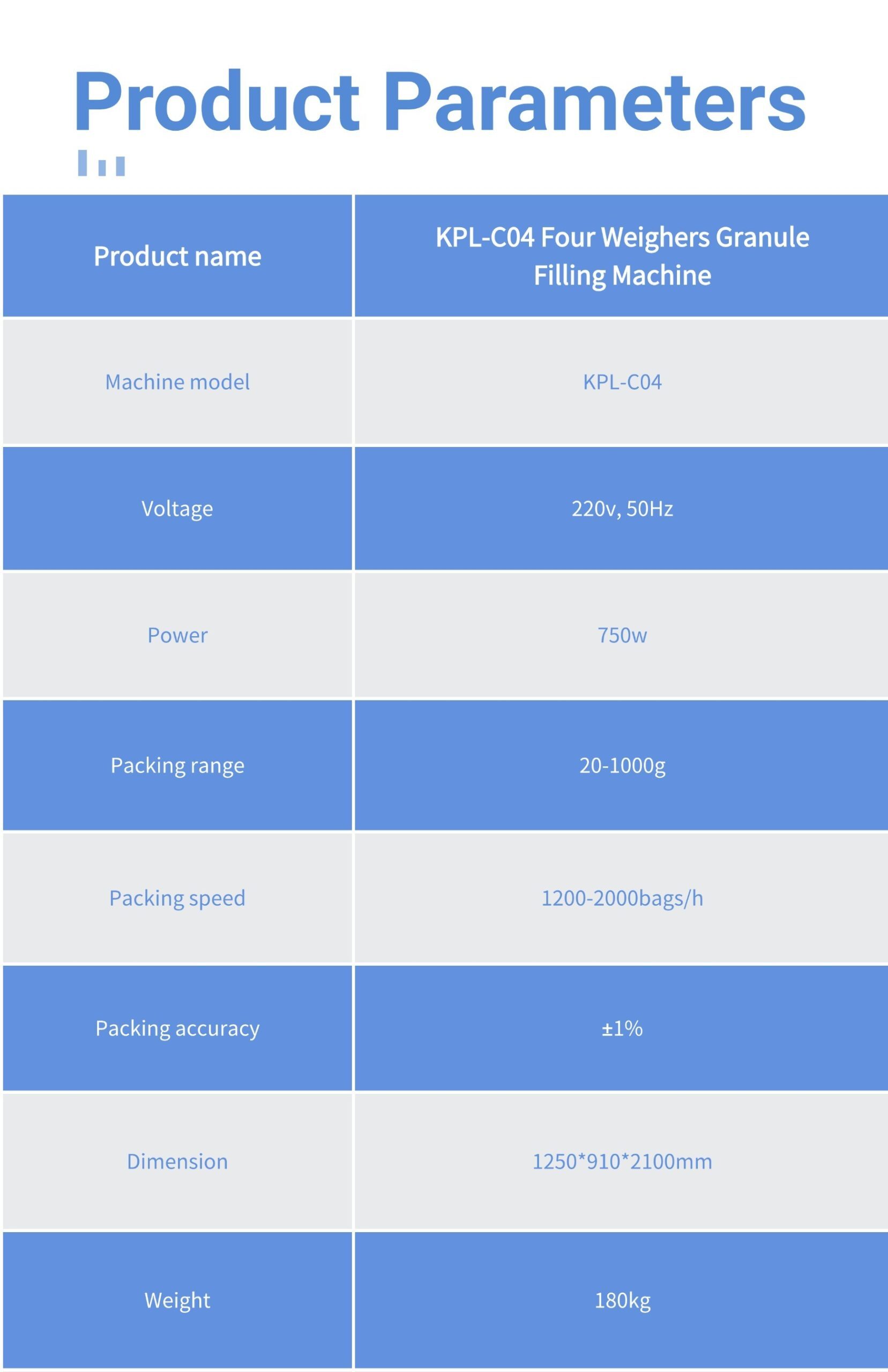 Product name | KPL-C04 Four Weighers Granule Filling Machine |