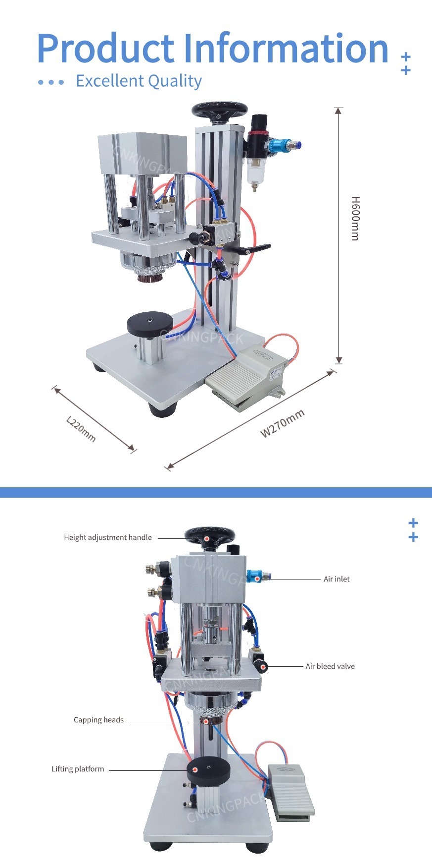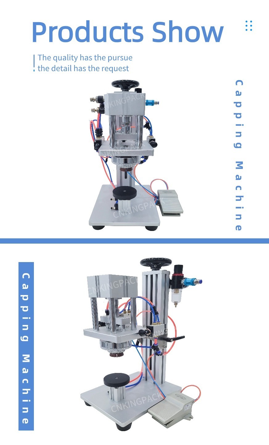 Capping for plastic lids of various bottles, jars, atomizer, etc .Widely used in cosmetic, drinks, chemical, medical, food industry etc, which can highly improve productivity and product quality.This High Quality Perfume Bottle Cap Sealer/Oral Solution Bottle Cap Pressing Capping Machine can applies to all kinds of glass bottle metal security cap, EZO, aluminum blocks and nozzle of the sealed cover, pressure thread etc.