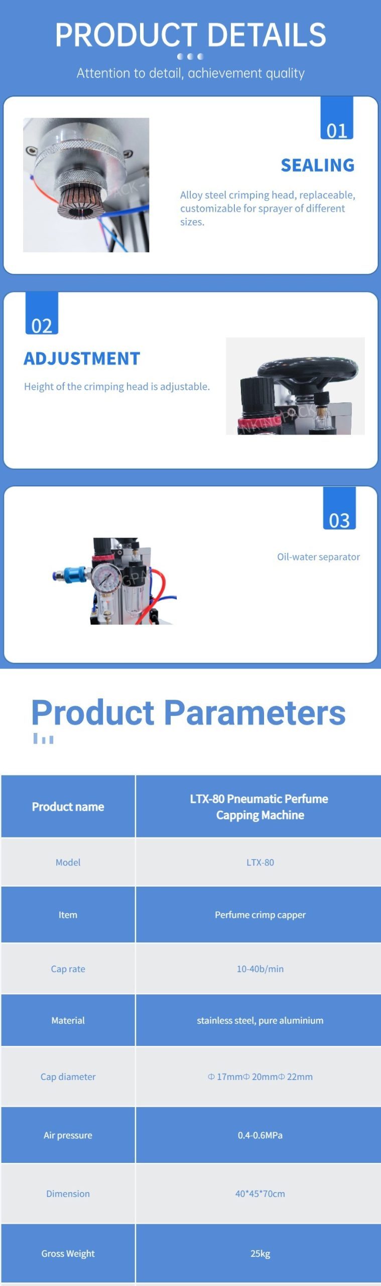The perfume crimping machine is a kind of clamping type cap closing machien.It is suitable for cap closing of spray type caps. The machine use the clamp to close the cap and fasten it on the edge of bottle mouth.The whole machine is composed of machine body,table surface, clamping device and pneumatic control system.