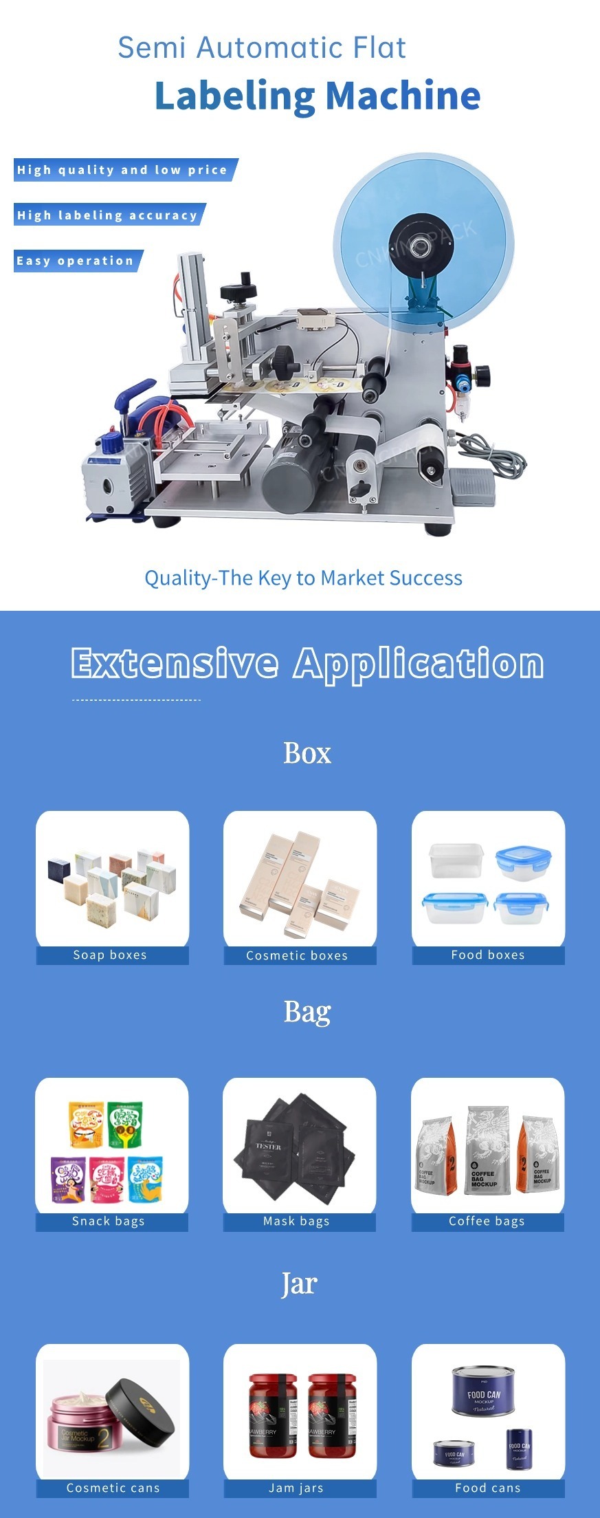 Semi-automatic flat labeling machine is a semi-automatic labeling machine that uses suction labeling method to achieve labeling on the flat surface of various workpieces, such as cosmetic flat bottles, packaging boxes, plastic lid labeling, etc.