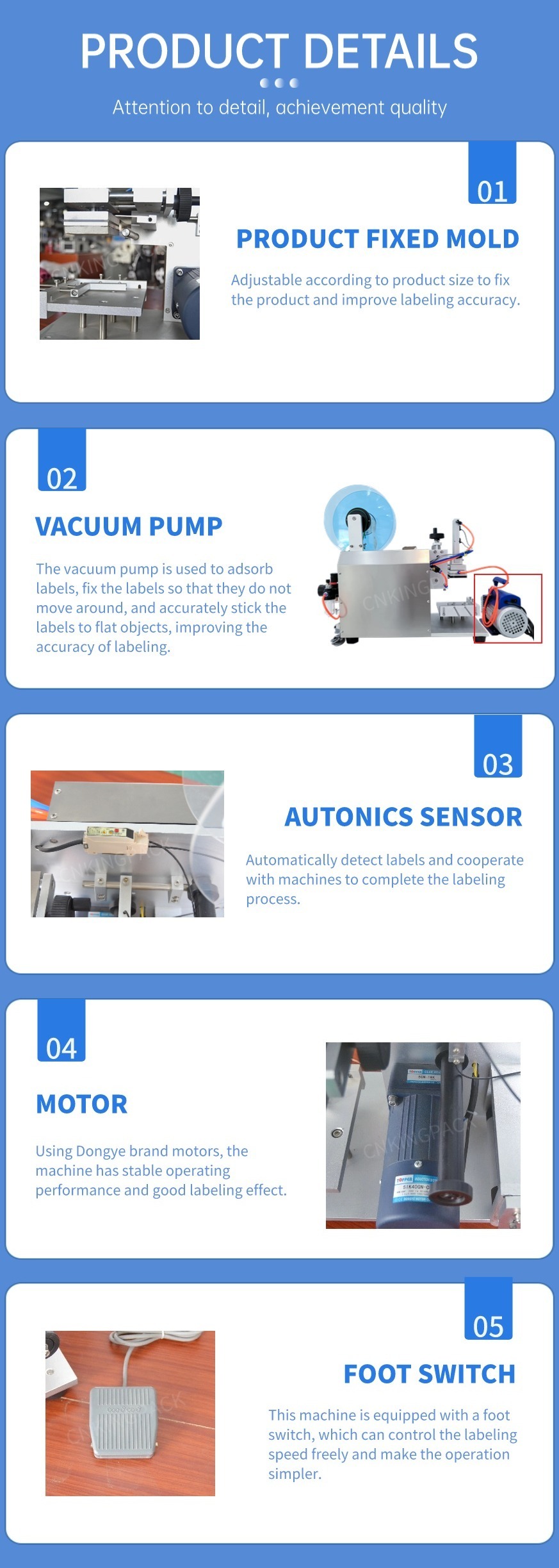 Achieve semi-automatic attachment of self-adhesive labels and self-adhesive films on the product surface; Function: Improve the efficiency of product labeling and film application, with accurate attachment position, good quality and high stability; avoid manual labeling and film application Low efficiency, a series of problems such as skewed attachment, blistering and wrinkles, irregular attachment positions, etc.; effectively reduce product costs, improve the aesthetics of product logos, and increase product competitiveness.