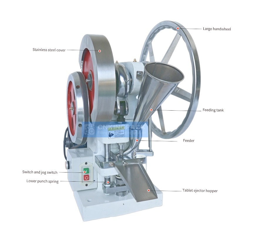 Suitable to compress tablets from diverse granular materials, including sugar pieces, calcium tablets, and uniquely shaped tablets.