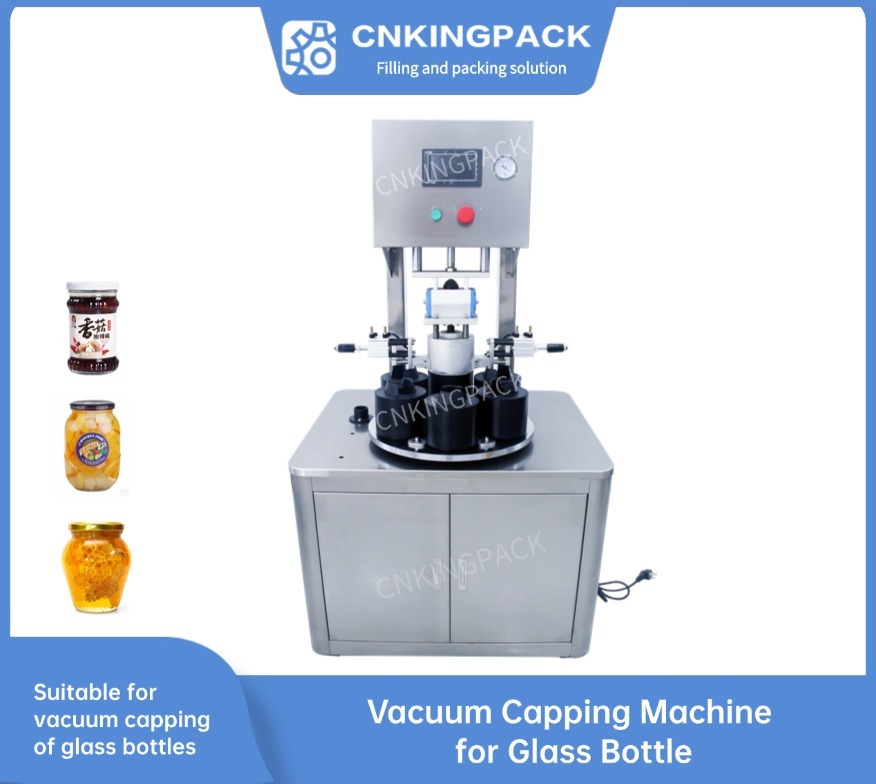 This four-head vacuum capping machine integrates vacuum and capping,Gland tightening, stable performance and easy operation,it is Widely suitable for vacuum capping of tinplate lid glass bottles in food, canned food, beverage, condiment, etc.